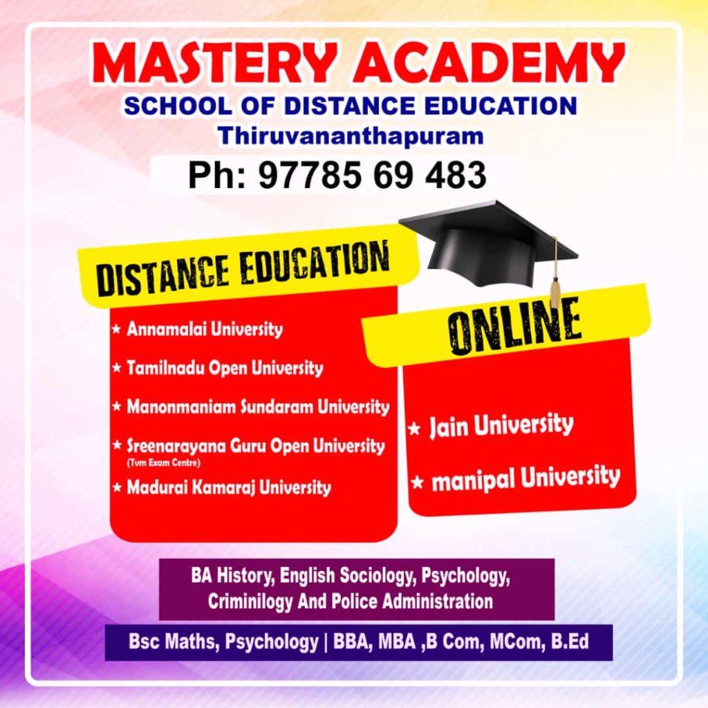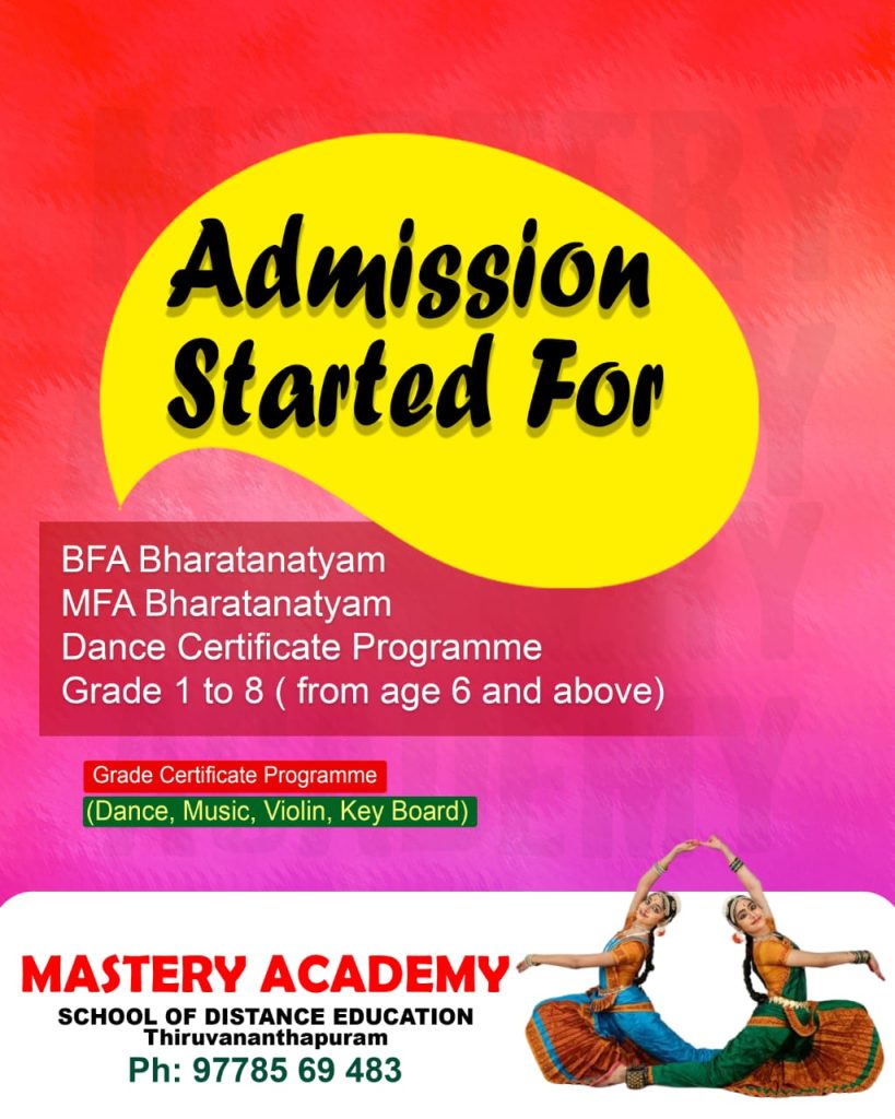 Courses SSLC, Plus Two – 6 Months BA, BBA BSW BFA Bharatanatyam MA Music MBA MSW MA Criminology MFA Bharatanatyam Music